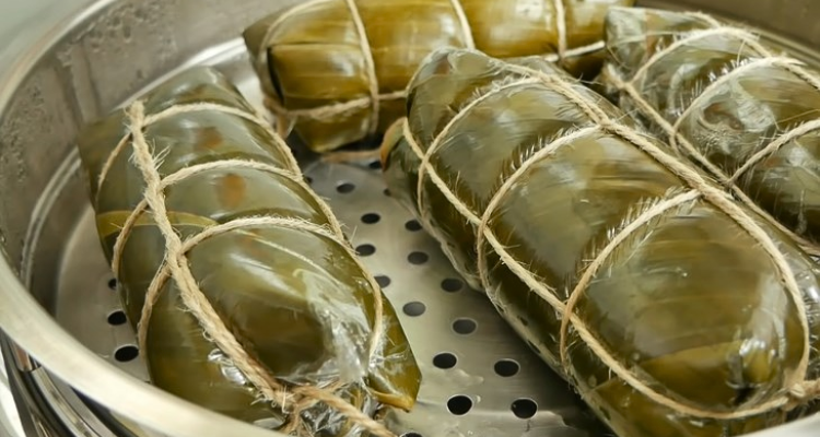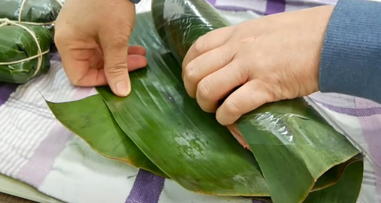 Lá chuối đem rửa sạch, luộc qua để lá chuối mềm và không gãy khi gói. Thời gian luộc khoảng 45 – 60 phút, sau đó vớt ra ráo nước một chút. Hoặc có thể đem phơi cho lá chuối héo tự nhiên.