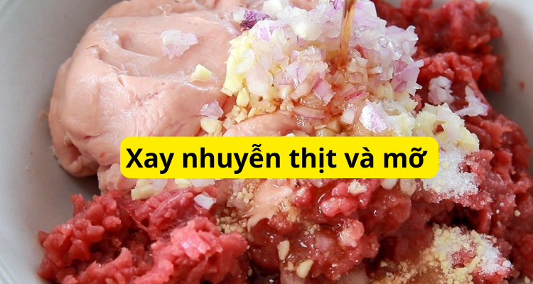 Thịt bò tươi lọc hết gân và mỡ vào cối đã ướp lạnh 15 phút xay nhuyễn toàn bộ. Trộn đều thịt đã xay với thìa nước mắm, thìa cà phê hạt nêm, một chút hạt tiêu, thìa cà phê đường cát và tỏi đã được băm nhuyễn để thịt bò thấm đều gia vị.